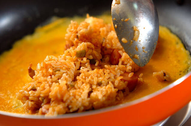 別のフライパンに人数分に分けたバターとサラダ油を中火で熱し、溶き卵を一気に流し入れる。全体に広げて卵が半熟のうちに、人数分に分けた(2)を縦向きにのせる。