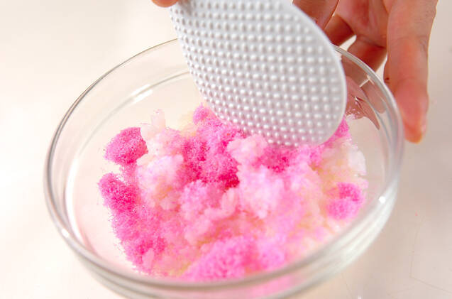 <合わせ酢>大さじ1.5を全体に飯台に薄く塗るように広げて、ご飯をあける。熱いご飯に、残りの<合わせ酢>を全体にまわし掛け、1分そのままおいて蒸らし、切るように手早く混ぜて飯台いっぱいに広げ、あおいで急激に冷ます。冷めたら1/6量を取り分け、桜デンブを混ぜ合わせる。
