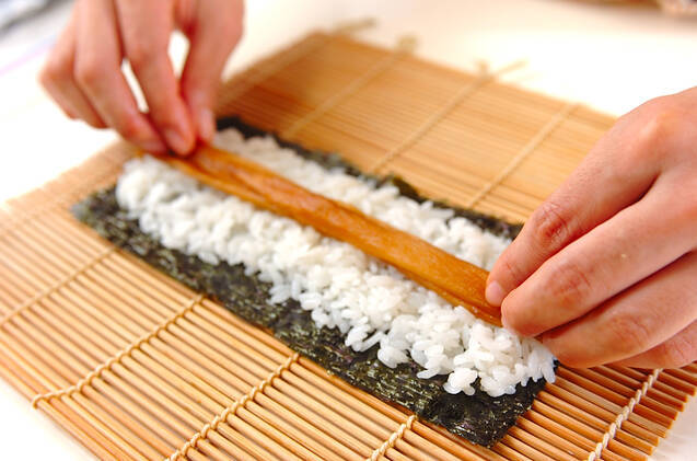 <カンピョウの甘煮>を作る。たっぷりの水で10分位下ゆでする。小鍋に他の材料と共に入れ、中火で10分煮る。そのまま冷まし、汁気を軽く絞ってのりの幅に切る。のりは1枚のみ半分に切る。巻きすに光沢のあるのりの表面を下にして置き、手に分量外の酢水をつけ、寿司飯の1/12量を軽くまとめ、のりの向こう側3cm位を残して全体に広げる。広げた寿司飯の中央を少しへこませ1/2量のカンピョウを並べて巻く。もう1本作る。