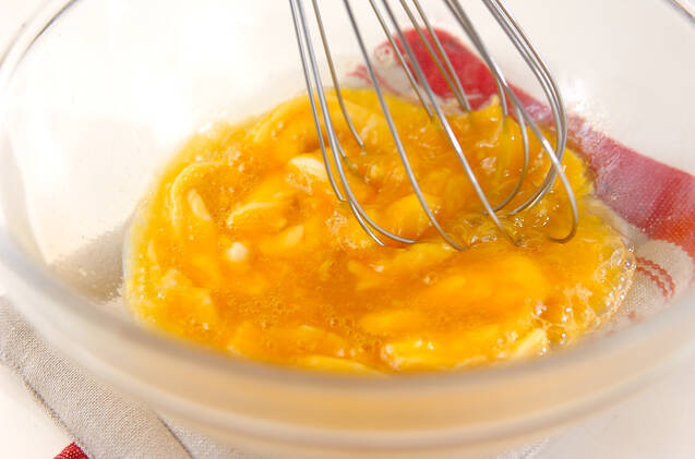 <チン!炒り卵>を作る。耐熱容器に卵を割りほぐし、他の材料と混ぜ合わせる。ラップはしないで電子レンジで1分加熱し、泡立て器で混ぜ合わせ、再び1分加熱して泡立て器で混ぜる。これを2~3回繰り返して炒り卵を作り炒り卵を作り、粗熱を取る。