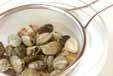 アサリは殻と殻をこすりあわせるように水洗いして、ザルに上げておく。