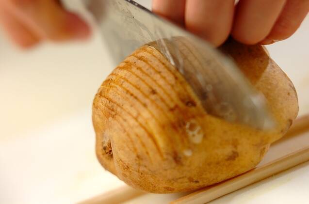 ジャガイモは皮ごとよく洗い、手前と奥に菜ばしを置いて幅2mmの深い切り込みを入れる。切り口を下にして10分水にさらす。