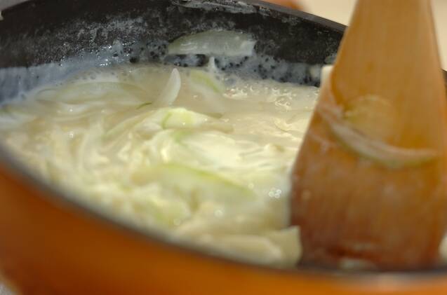玉ネギがしんなりしたら小麦粉を加え、粉っぽさがなくなるまで炒め合わせる。牛乳を加え、混ぜながらトロミがつくまで火を入れる。