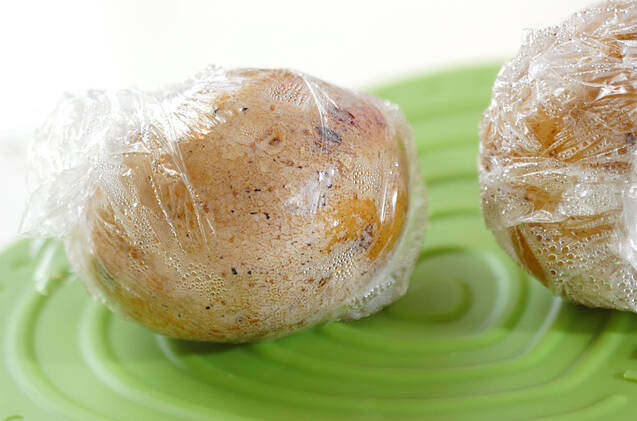 ジャガイモは皮ごときれいに水洗いし、1個ずつラップに包んで電子レンジで3~4分加熱する。竹串を刺してみてスッと刺さったらOKです。(ヒント)電子レンジは600Wを使用しています。