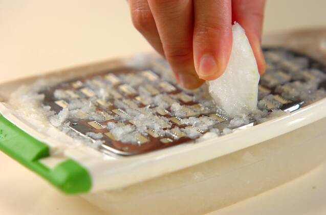 大根は皮をむいてすりおろし、ザルにあげて汁気をよくきる。
