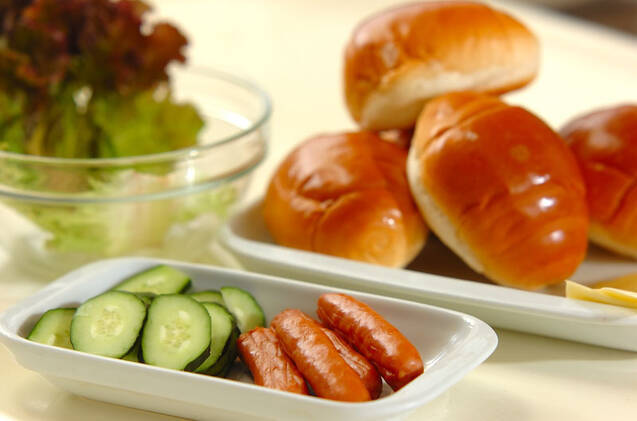 キュウリは斜め薄切りにする。サニーレタスは水にさらして水気をきり、食べやすい大きさにちぎる。バターロールの真ん中に切れ目を入れる。