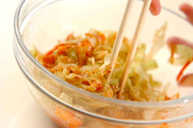 キャベツ、白菜キムチ、<調味料>の材料を混ぜ合わせ、器に盛る。