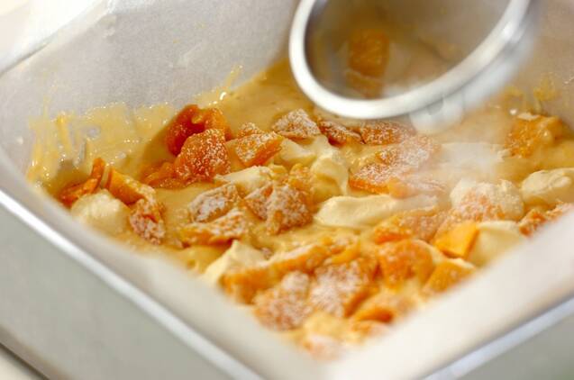 オーブンシートを敷いた型に(2)を流し入れ、クリームチーズ、マンゴーを散らして粉糖を振る。