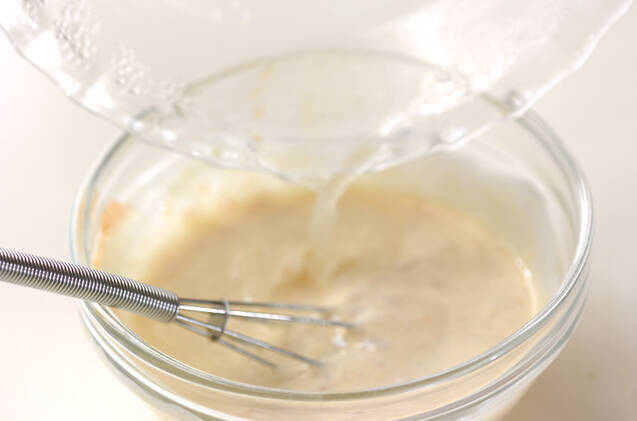 ボウルに<梅ドレッシング>、ささ身の蒸し汁を合わせる。