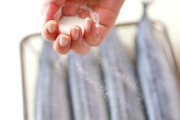 生サンマは包丁で尾から頭の方にヌメリをこそげ、きれいに水洗いして水気を拭き取る。振り塩をして10分以上置いて身をしめ、出てきた余分な水分を拭き取る。(振り塩は手に塩を持ち、並べた魚の20~30cm位上から指の間を通して均等に塩を振り掛けることです。身の厚い部分には少し多いめに振り掛けて下さい)※2尾の場合は長さを半分に切って下さい。