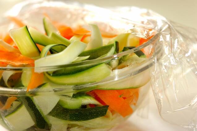 <ズッキーニとニンジンのリボンサラダ>を作る。ズッキーニとニンジンは耐熱容器に入れてふわっとラップをし、電子レンジで1分加熱する。