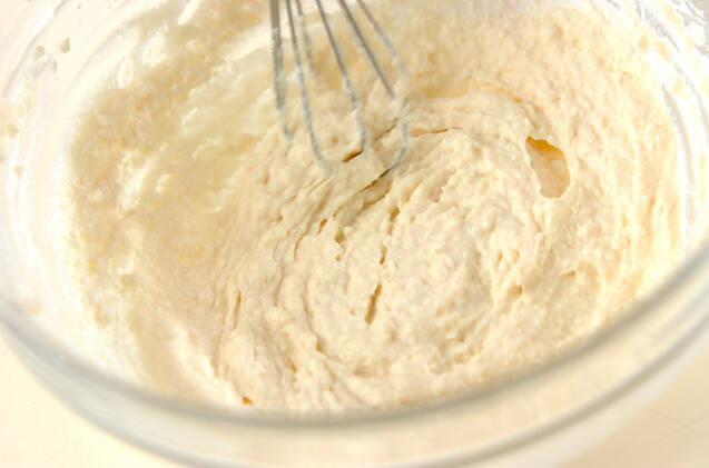 ボウルに絹ごし豆腐を入れ、泡立て器で滑らかになるまで混ぜ、さらに<調味料>の材料を加えて混ぜ合わせる。
