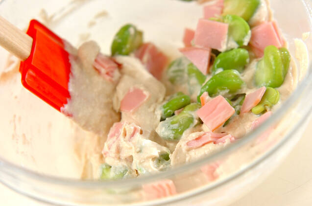 (1)にソラ豆とハムを加えて和え、器に盛る。