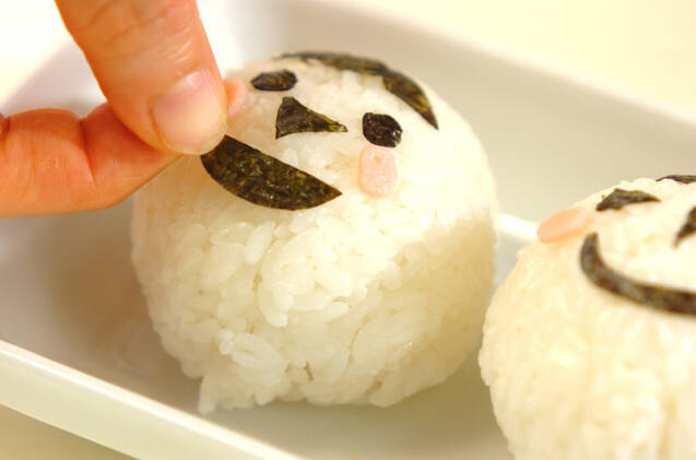 <にこにこおにぎり>を作る。丸くにぎったおにぎりに、顔のパーツをのせる。