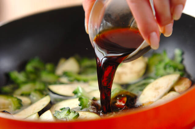 フライパンにサラダ油を強火で熱し、ゴーヤ、ナスを炒め、だし汁を加える。煮たってきたら、<調味料>の材料を加え、再び煮たったら2~3分煮る。