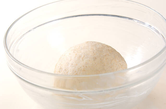 <パン生地>がしっとりしてきたら更に30秒攪拌する。<パン生地>のキメが細かくしっとりしたら平らな台にひっくり返し、<パン生地>を下に巻き込む感じで丸く形を整える。ショートニングを塗ったボウルに入れてラップをし、<パン生地>が2倍に膨れるまで温かなところで一次発酵させる。(約40~60分)※指に粉をつけて<パン生地>の中央に差し込み、<パン生地>が戻ってこなければ一次発酵終了。