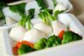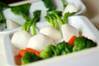 小カブは軸を5cm残して葉を切り落とし、皮をむき、縦2~4つに切く。たっぷりの塩を入れた熱湯で、ブロッコリー、小カブ、ベビーキャロットをゆでる。水に取り、粗熱が取れれば水気をきる。