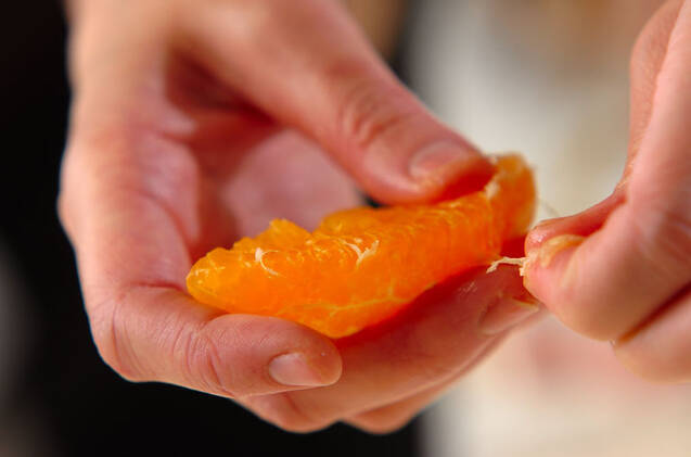 デコポンを小房に分け、薄皮をむく。水菜は3cmの長さに切り、さっと氷水にさらして水気をきる。