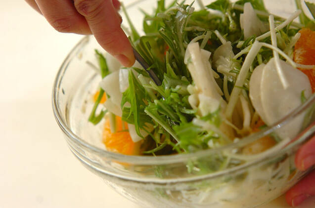 大きめのボウルに<調味料>の材料を入れてよく混ぜ、デコポン、水菜、カブ、ちぎったディルを入れてよく和える。