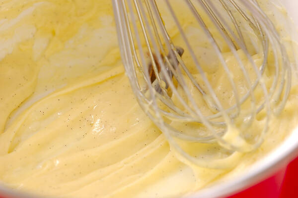 7をこしながら鍋に戻し入れ、再び中火にかけ、絶えず泡立て器で混ぜ、鍋底からフツフツ沸騰して完全に火が入ったら火から外し、バターを加えて混ぜる。バットに移し広げて表面にぴったりラップフィルムを掛け、底を氷水にあてて冷やす。