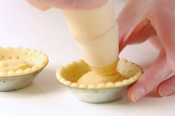 丸口金をつけた絞り袋に5の<アーモンドクリーム>を詰め、9のタルト生地の上に渦巻状に絞り出す。(約20g)170℃のオーブンで30~40分焼き、冷めたら表面に<シロップ>を刷毛で塗る。<カスタードクリーム>を焼いたタルトの表面に薄く絞り出す。イチゴを飾り、お好みで粉砂糖、刻みピスタチオを振る。ここではガスオーブンを使用しています。オーブンにより、温度差や焼き時間には違いがあるので、ふだんからお家のオーブンの癖を知っておくことをおすすめします。目安として小型の電気オーブンの場合、レシピより10~20℃高い設定にして下さい。※今回は光沢を出すために、ナパージュ(製菓用のジャム)をイチゴに塗っています。薄い寒天液を塗っても同じ効果が得られます。