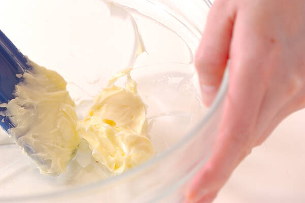 <タルト生地>を作る。室温に戻したバターをボウルに入れクリーム状になるまで混ぜ、粉砂糖を加えすり混ぜる。