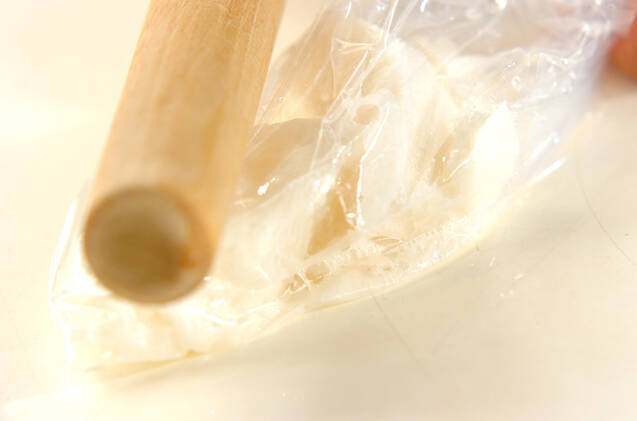 長芋は皮をむき、ビニール袋等に入れ、すりこ木でたたいて粗く崩す。