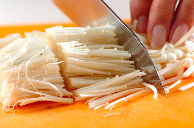エノキは石づきを切り落とし、長さを3等分に切る。