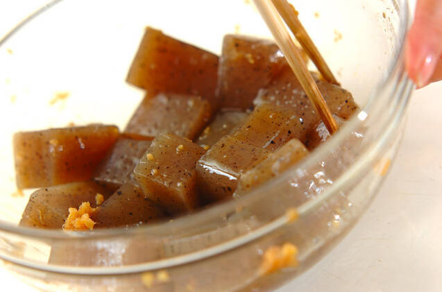 板コンニャクはフォークで両面穴をあけてひとくち大に切り、たっぷりの水と共に鍋に入れる。煮たったら1~2分ゆでて臭みを抜き、ザルに上げて水気をきり、<下味>の材料とからめる。