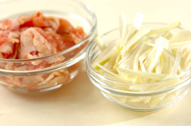 豚肉はひとくち大に切り、<下味>の材料をもみ込む。エシャロットは長さ3~4cmに切り、さらに厚さ2~3mmの薄切りにする。