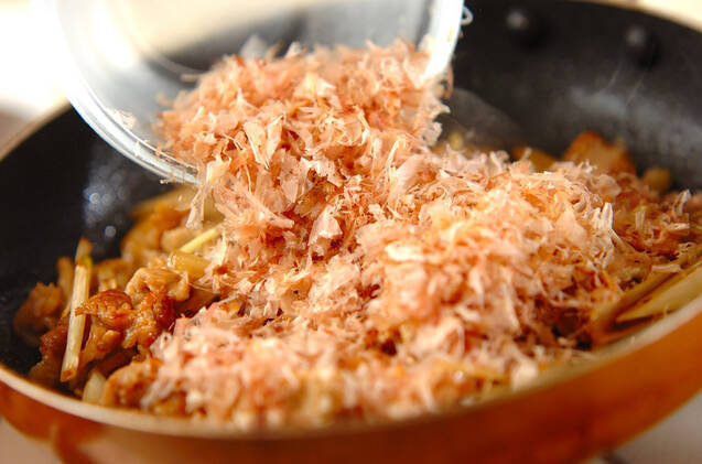フライパンにサラダ油をしいて中火にかけ、豚肉を炒める。豚肉の色が変わったらエシャロットを加え、全体に油がまわったら麺つゆ、酒を加える。水分が飛んだらかつお節、一味唐辛子を加えて炒め合わせ、器に盛る。