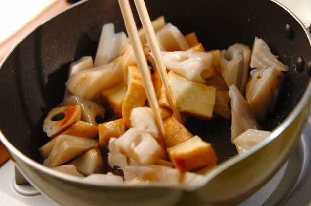 混ぜ合わせた<調味料>の材料を加えて、炒め合わせる。