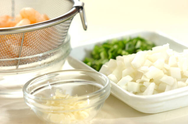 むきエビは背ワタを取り、熱湯でゆでてザルに上げる。