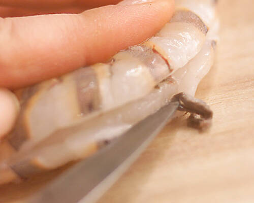 胴の殻をむき、背に浅く切り込みを入れて背ワタを取り除き、水洗いする。