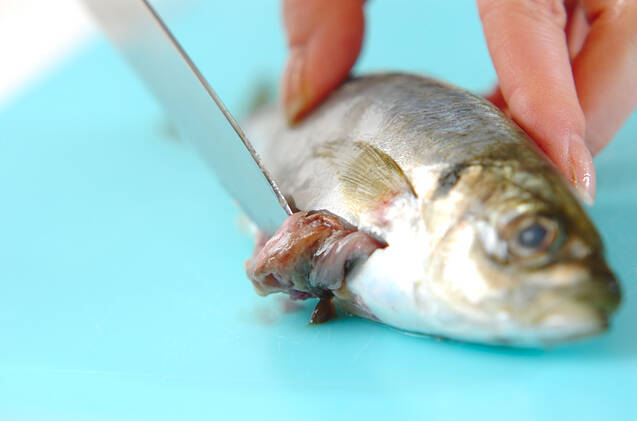 アジは尾から頭に向かってウロコを取る。盛り付けた時裏になる側(頭を右、腹を手前)からエラを取り、尾の付け根にある固いウロコ状のゼイゴを尾側から頭に向かって両面とも削ぎ取る。裏側の腹に4cm位の切り込みを入れてワタを出し、きれいに洗う。火が通りやすいように、裏になる側には骨にそって横に1本切り込みを入れる。表側の身の厚い部分に飾り包丁を入れる。