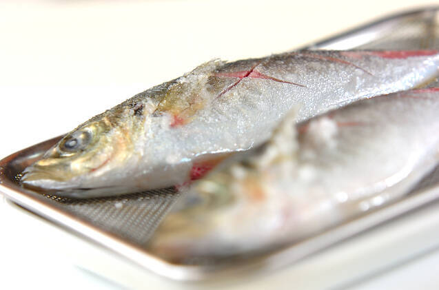 アジに化粧塩(尾びれ、背びれ、腹びれに塩をたっぷりつける)をし、振り塩(手に塩を持ち、魚から30cmの高さで指の間から塩を振り落とすと全体にうまく塩が振れます)をする。予熱してサラダ油少々をぬった網に並べ、弱火のグリルで10~12分焼く。焦げる場合はホイルを魚に掛けて、焦げるのを防いで下さい。※ここでは両面焼きグリルを使っています。