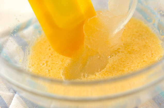 ボウルで卵黄、砂糖、水80mlをよく混ぜ合わせてこし、耐熱容器に入れる。ラップをかけて電子レンジで2分加熱する。温かいうちにふやかしたゼラチンを加えて溶かす。電子レンジは600Wを使用しています。