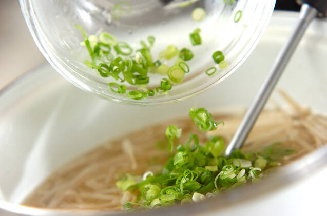 煮たったら<調味料>の材料を加え、再び煮たったら、刻みネギを加えてひと混ぜし、器に注ぐ。