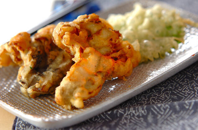 マイタケと大葉に小麦粉をしっかりつけておくのがポイント。冷めてもサクサクとした食感に。