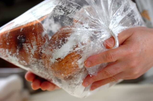 粗熱が取れたら、粉糖を入れた抗菌のビニール袋の中に入れ、空気を入れて優しく振りながらまぶす。