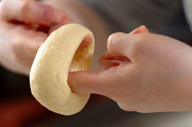 【成形】軽くガス抜きをして、丸め直す。生地の真ん中に人差し指を差し込み中心に穴をあけて、下からも人差し指を入れ、両手の指でクルクルと穴を広げ、穴が直径3cmくらいになるまで広げる。