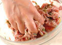 ボウルに豚ひき肉、ホタテ貝柱(汁ごと)、1、<調味料>の材料を入れ、粘りが出るまでよく練り20等分にする。