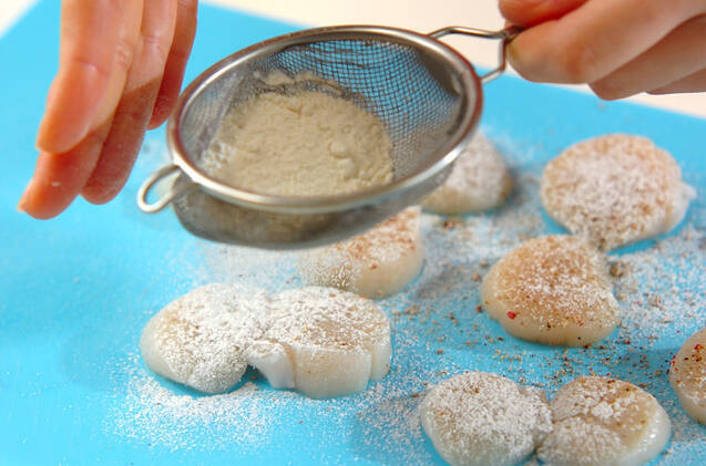 ホタテは厚みを半分に切り、塩コショウをして小麦粉をまぶす。