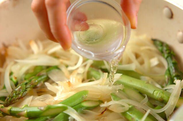 同じフライパンに残りのバターを加え、グリーンアスパラ、玉ネギを炒め、酒を加えて玉ネギがしんなりするまで炒める。
