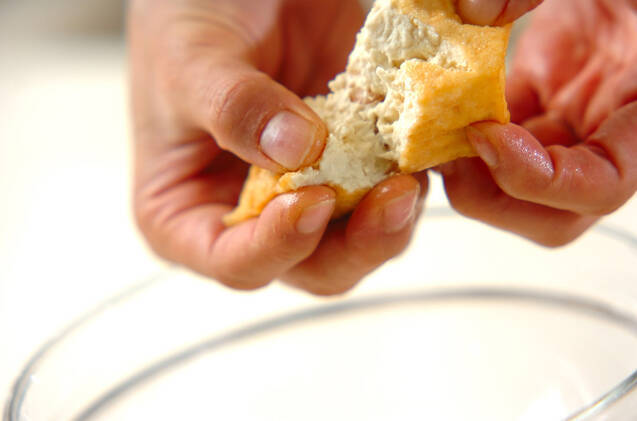厚揚げは熱湯をかけて表面の油を落とし、手でひとくち大にちぎる。