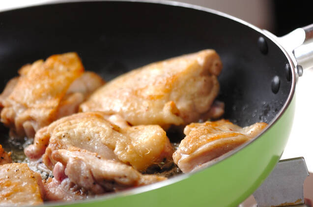 フライパンにオリーブ油とバター10gを中火で熱し、鶏肉に両面こんがりと焼き色をつける。
