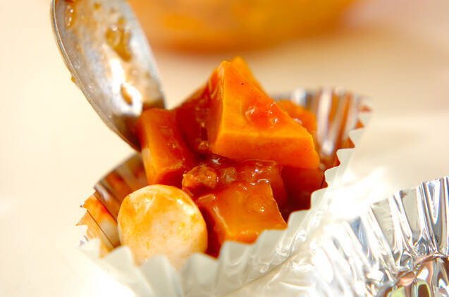 ボウルでカボチャ、モッツァレラチーズ、ミートソースを和え、アルミカップに分け入れる。