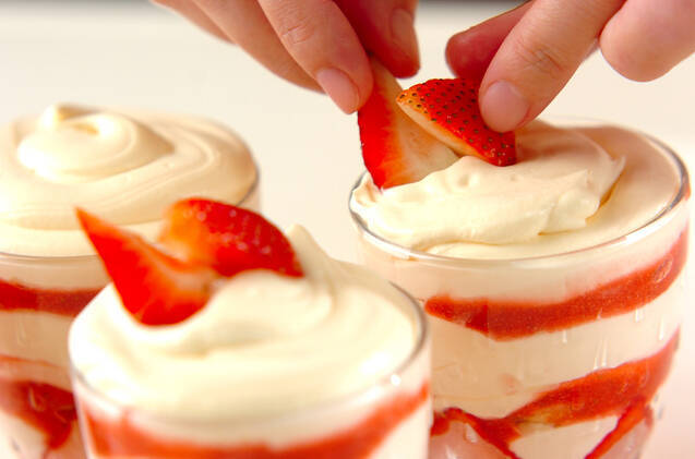 仕上げに薄くココアパウダーを振るい、お好みの大きさに切ったイチゴ、ミントの葉を飾る。
