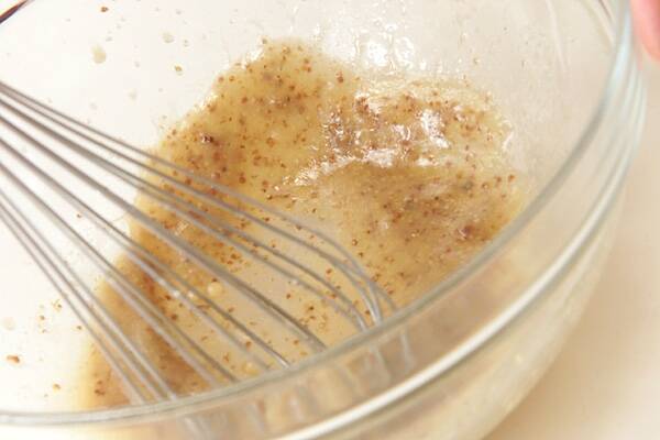 <ドレッシング>を作る。アンチョビを細かく刻み、ボウルに赤ワインビネガー、レモン汁、粒マスタード、砂糖と混ぜ合わせる。最後にオリーブ油を少しずつ加えながら混ぜ合わせ、塩コショウで味を整える。