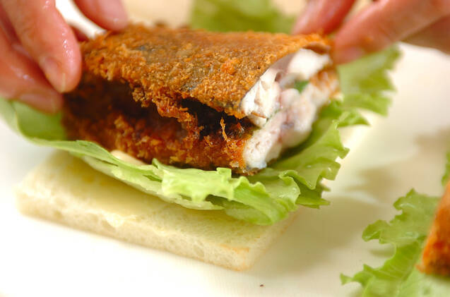 食パンは軽く焼き、2枚の片面にバター、練りからしをぬる。レタスをのせてマヨネーズをかけ、(2)のアジフライをのせてウスターソースをかけ、残りの食パンでサンドする。